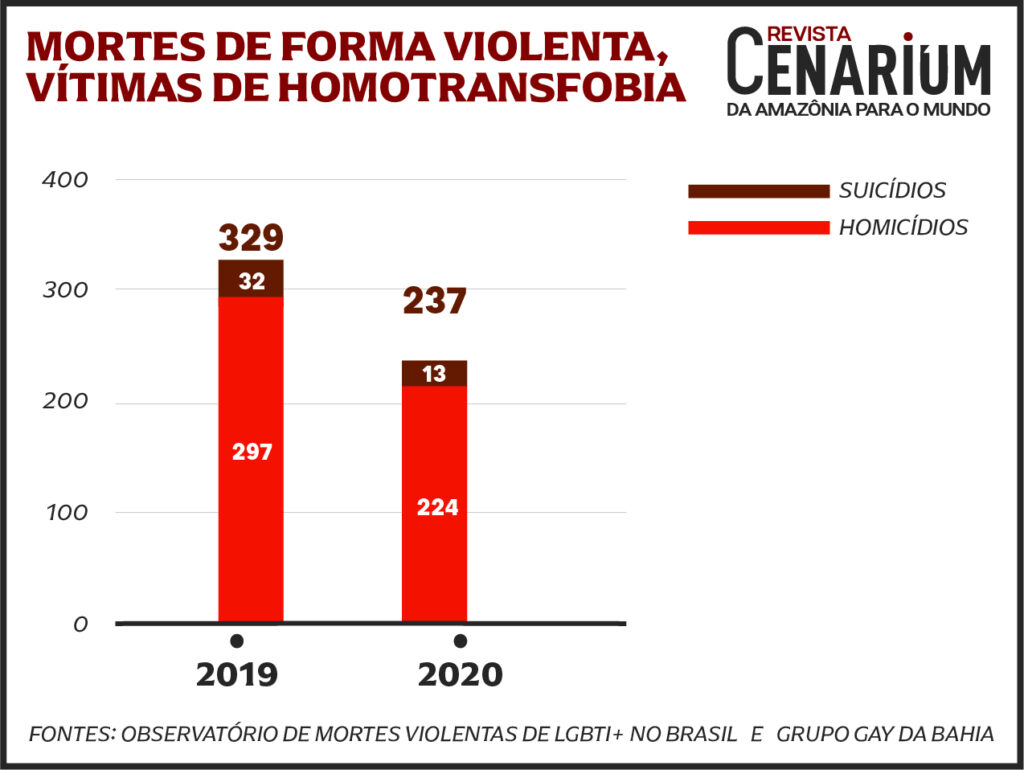 Este mesmo relatório mostrou que, dessas mortes, 297 foram homicídios (90,3%) e 32 suicídios (9,7%). Neste ano, um relatório, divulgado dia 14 de maio, pelo Observatório de Mortes Violentas de LGBTQIA+ no Brasil, apontou que 237 pessoas LGBT tiveram suas vidas ceifadas por conta da homotransfobia.