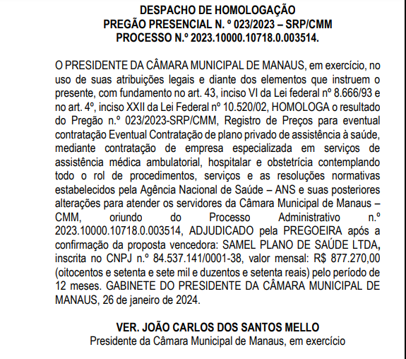 Conforme o pregão presencial N° 023/2023 – SRP/CMM, o valor a ser pago à Samel foi dividido em 12 meses em parcelas de R$ 877,2 mil. A contratação assinada pelo vice-presidente da Câmara, vereador João Carlos (Republicanos), foi publicada no Diário Oficial da CMM. Na aba de transparência do site da Casa, a reportagem não conseguiu obter informações sobre o contrato digitando a numeração dele.