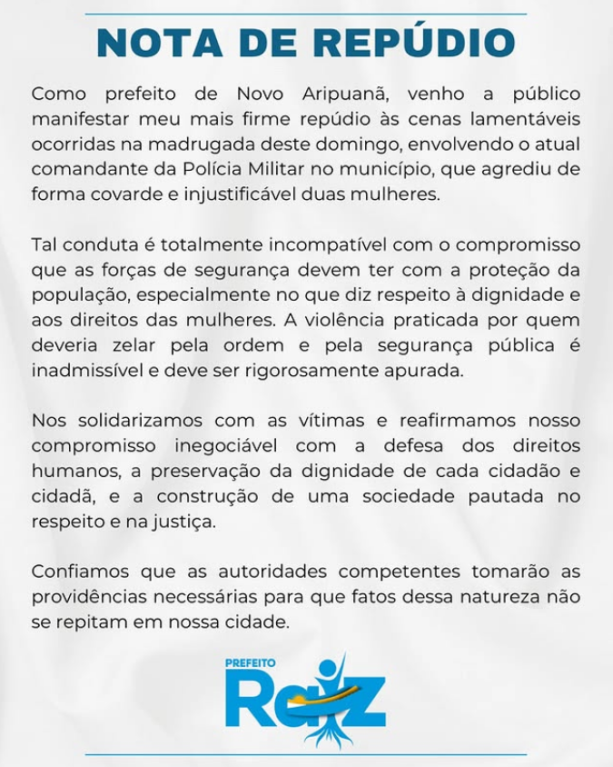 Após a repercussão do caso, o prefeito de Novo Aripuanã, Raymundo Lopes de Albuquerque Sobrinho (União Brasil), conhecido como Raiz, se manifestou nas redes sociais sobre o que chamou de “cenas lamentáveis” envolvendo o comandante da Polícia Militar no município.
