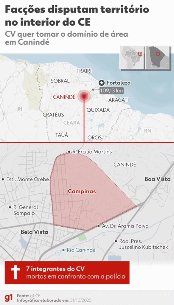 Redação – Sete membros da facção Comando Vermelho morreram na madrugada desta sexta-feira (31), por volta das 3h, em confronto com a polícia na cidade de Canindé, no interior do Ceará. Os corpos foram encaminhados para o Instituto Médico Legal.