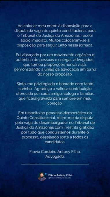 Redação – O advogado Flávio Cordeiro Antony Filho anunciou, nesta segunda-feira (17), por meio de suas redes sociais, sua retirada da disputa pela vaga destinada ao Quinto Constitucional da OAB no Tribunal de Justiça do Amazonas (TJAM). A eleição está agendada para esta quarta-feira (19).