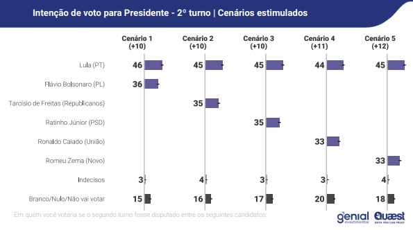 No segundo turno, Lula venceria todos os adversários testados. Contra Flavio Bolsonaro, o placar seria de 46% a 36%. Em uma eventual disputa com Tarcísio de Freitas, o presidente venceria por 45% a 35%. Nos confrontos com Ratinho Júnior, Romeu Zema e Ronaldo Caiado, Lula também manteria vantagem, variando entre 10 e 12 pontos percentuais.