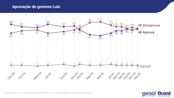 Apesar da vantagem eleitoral nos cenários simulados, a avaliação do governo Lula mostra um País dividido. De acordo com a pesquisa, 49% dos entrevistados desaprovam o trabalho do presidente, enquanto 48% aprovam, configurando um empate técnico dentro da margem de erro.
