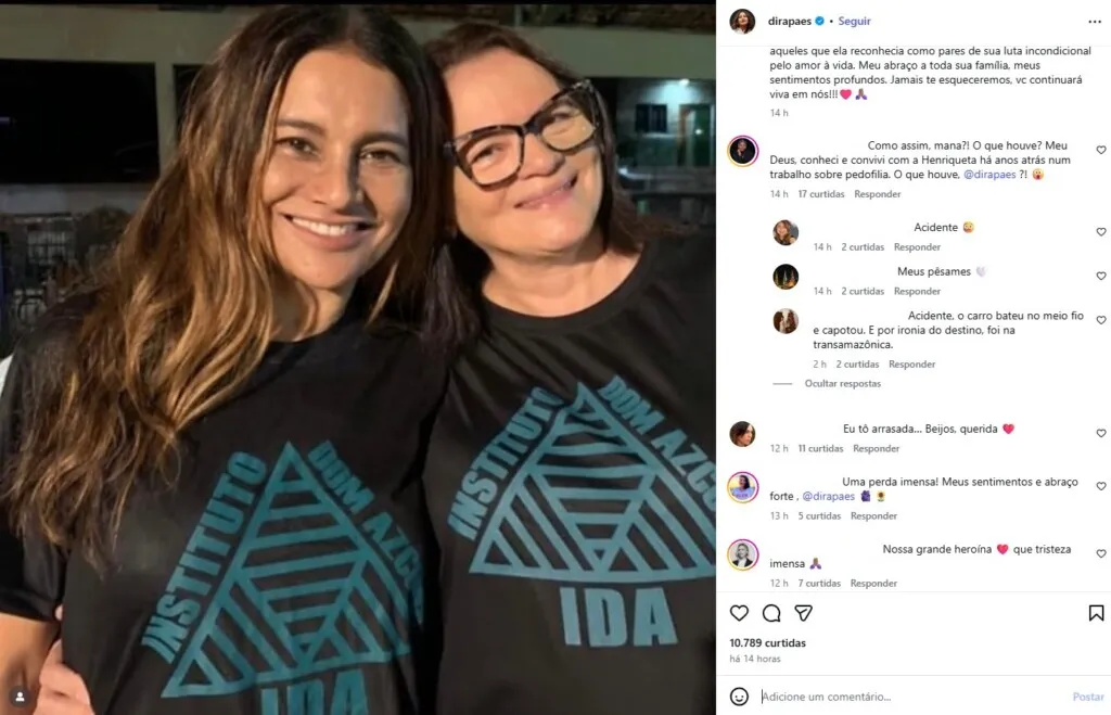 A atriz Dira Paes usou as redes sociais para lamentar a morte da Irmã Henriqueta e prestar homenagem à defensora dos direitos humanos. “Dona de um dos abraços mais afáveis, uma confiança que motivava e uma força que se reconhecia só de olhar”, escreveu a artista.