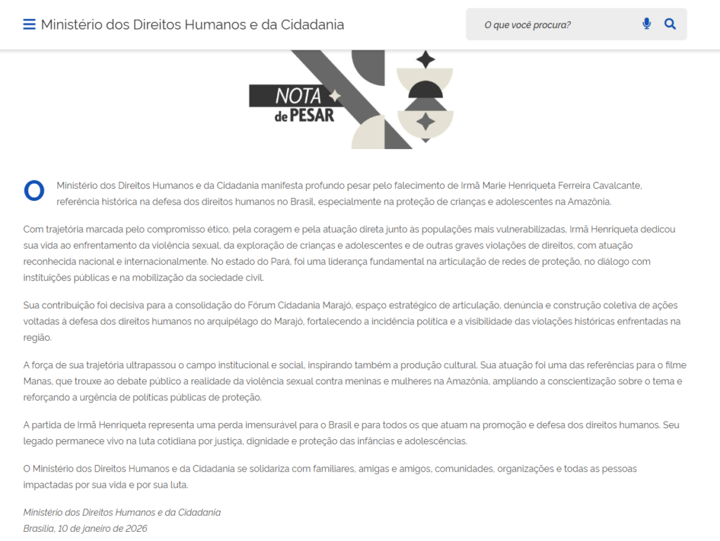 “Com trajetória marcada pelo compromisso ético, pela coragem e pela atuação direta junto às populações mais vulnerabilizadas, Irmã Henriqueta dedicou sua vida ao enfrentamento da violência sexual, da exploração de crianças e adolescentes e de outras graves violações de direitos, com atuação reconhecida nacional e internacionalmente. No estado do Pará, foi uma liderança fundamental na articulação de redes de proteção, no diálogo com instituições públicas e na mobilização da sociedade civil“, diz trecho da nota.