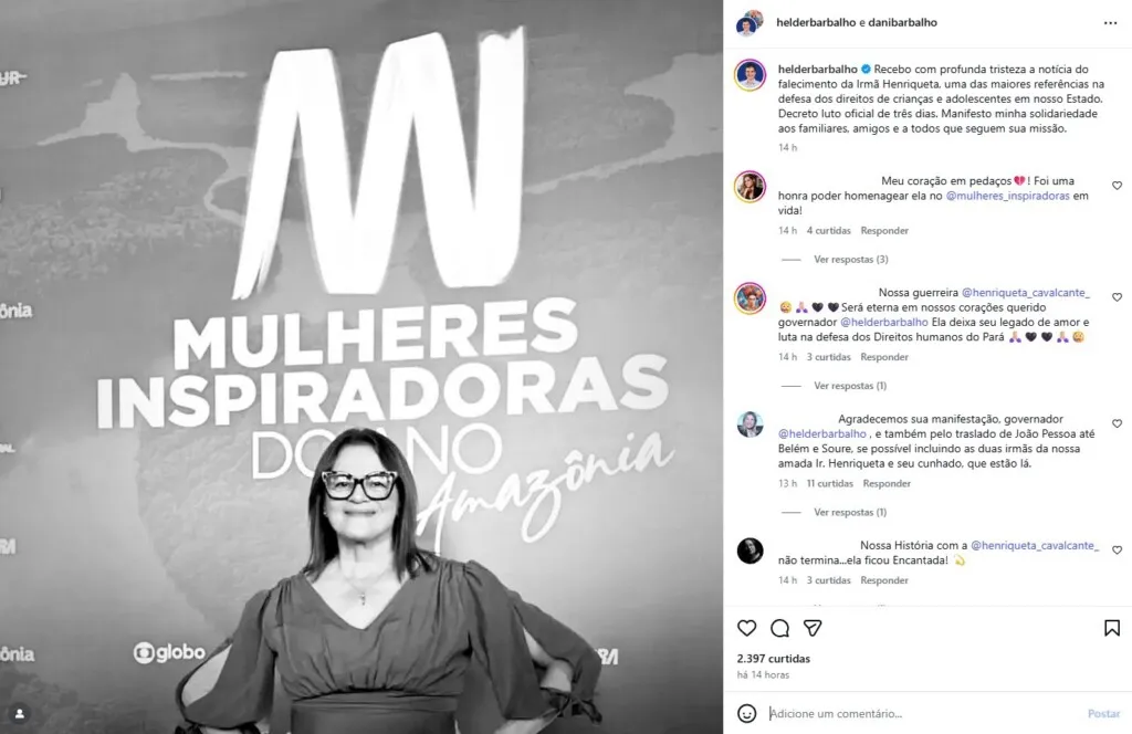 O governador do Pará, Helder Barbalho (MDB), também usou as redes sociais para se manifestar sobre o falecimento da defensora dos direitos humanos. O político afirmou que Irmã Henriqueta era “uma das maiores referências na defesa dos direitos de crianças e adolescentes” no Estado.