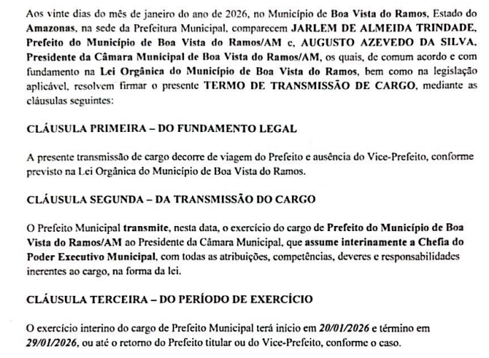 O afastamento temporário de Jarlem Trindade está formalizado em Termo de Transmissão de Cargo, assinado na última terça-feira, 20, o qual a CENARIUM teve acesso. O documento transfere a chefia do Executivo ao presidente da Câmara até o próximo dia 29, em razão de viagem do titular e da ausência do vice-prefeito. Veja documento: