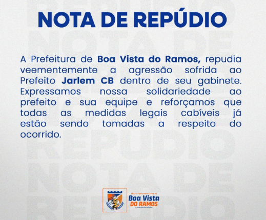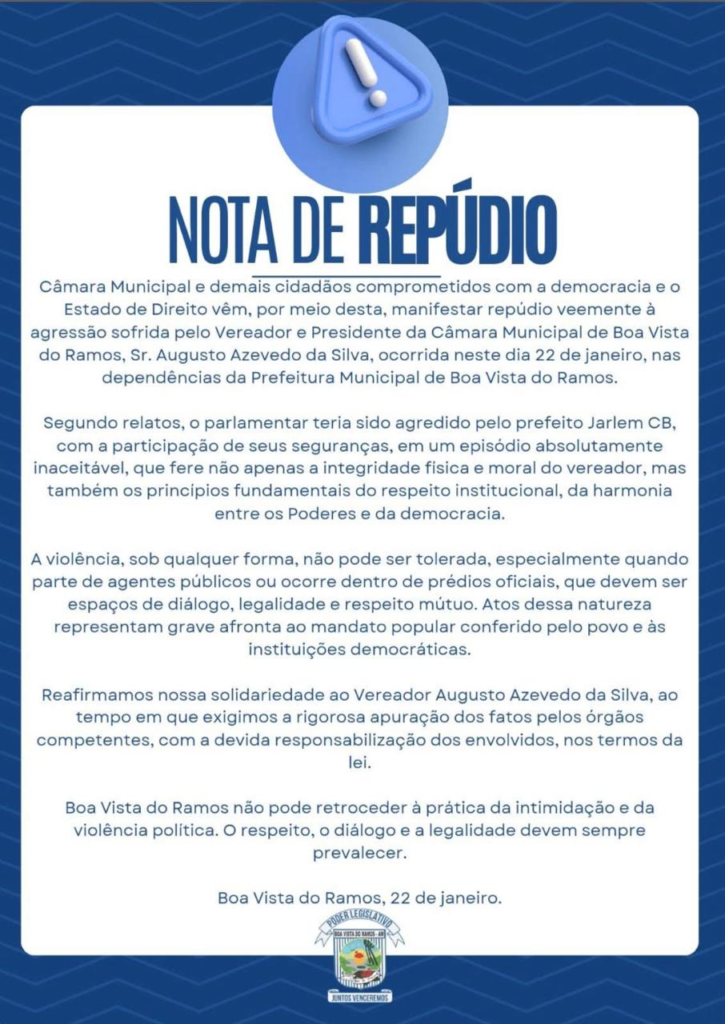 Após o registro da ocorrência, a Câmara Municipal divulgou nota oficial repudiando “a agressão sofrida pelo vereador Augusto Azevedo nas dependências da Prefeitura Municipal de Boa Vista do Ramos”. O texto classifica o episódio como violação ao respeito institucional e defende apuração rigorosa dos fatos pelos órgãos competentes.