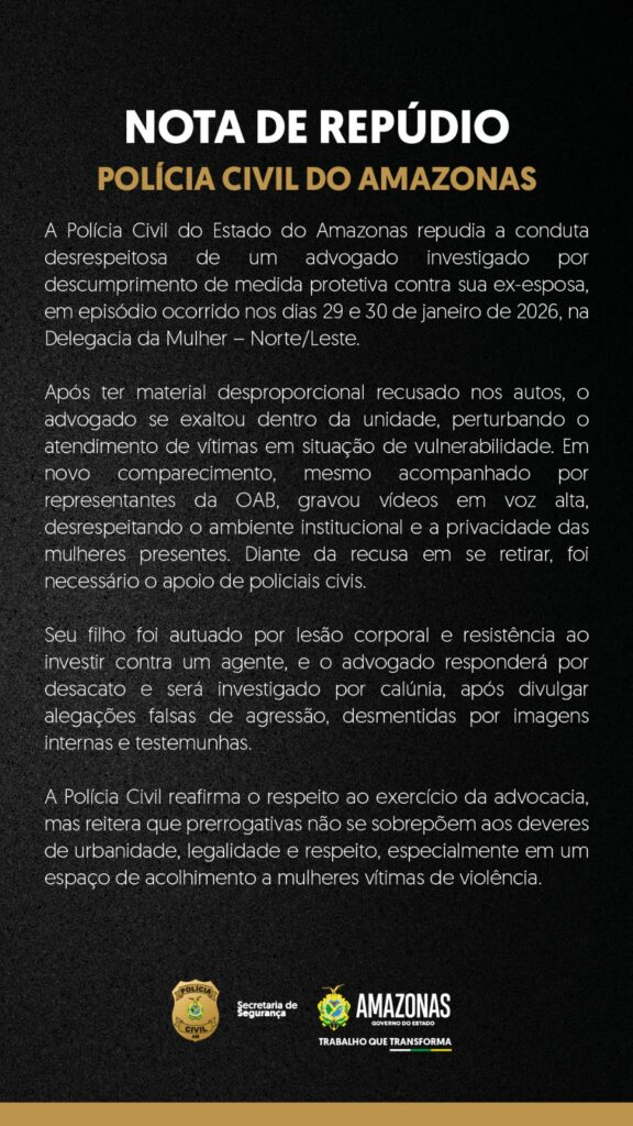 A Polícia Civil do Amazonas (PC-AM) divulgou, neste sábado, 31, nota de repúdio à conduta do advogado Robert Lincoln da Costa Areias e disse que ele é investigado por descumprimento de medida protetiva contra a ex-esposa. Segundo a corporação, após ter um pedido considerado desproporcional negado nos autos, ele se exaltou dentro da unidade e perturbou o atendimento de mulheres em situação de vulnerabilidade.