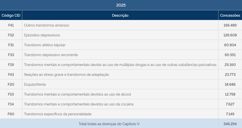 Entre os diagnósticos que mais resultaram em concessão de benefícios por incapacidade temporária em 2025 estão as doenças classificadas no Capítulo V da Classificação Internacional de Doenças (CID-10), que engloba os transtornos mentais e comportamentais. Destacam-se os outros transtornos ansiosos, episódios depressivos, transtorno afetivo bipolar e transtorno depressivo recorrente, indicando o impacto crescente dessas condições na saúde dos trabalhadores.