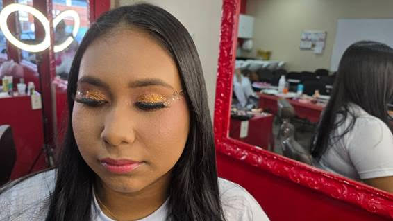 A segunda maquiagem segue uma proposta mais direta e prática, com foco absoluto no olhar. O visual é construído a partir do brilho dourado, sem esfumar ou misturar as cores, o que facilita a reprodução mesmo para quem não tem experiência.