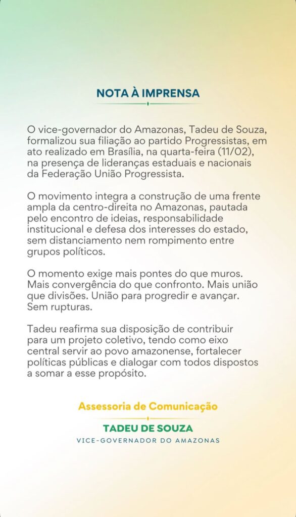 Em nota à imprensa, Tadeu de Souza destacou que a filiação “integra a construção de uma frente ampla da centro-direita no Amazonas, pautada pelo encontro de ideias, responsabilidade institucional e defesa dos interesses do Estado, sem distanciamento nem rompimento entre grupos políticos”.