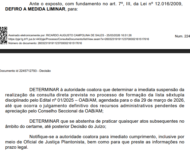 Também são questionados requisitos de elegibilidade da candidata, como a comprovação de tempo mínimo de exercício profissional e a compatibilidade com a função exercida no Tribunal Regional Eleitoral do Amazonas. Esses pontos, no entanto, não foram analisados em profundidade na decisão liminar, que se concentrou na regularidade procedimental.