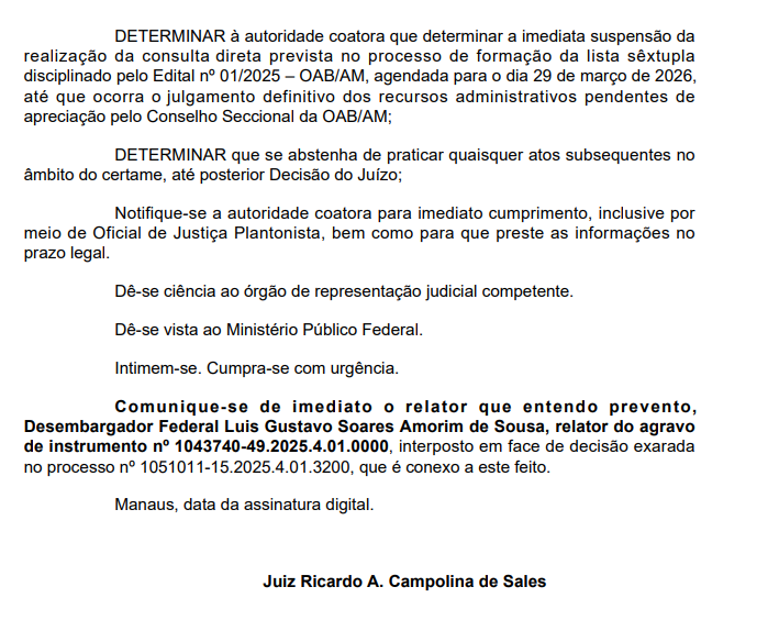 Redação – A Justiça Federal – Seção Judiciária do Amazonas determinou, nesta quarta-feira, 25, a suspensão da consulta direta da Ordem dos Advogados do Brasil Seccional Amazonas (OAB-AM) que definiria a lista sêxtupla para o Tribunal de Justiça do Amazonas (TJAM). A votação estava marcada para o próximo domingo, 29. A decisão liminar foi concedida pelo juiz federal Ricardo A. Campolina de Sales e atendeu a um pedido da advogada Caroline Frota. Veja trecho da decisão: