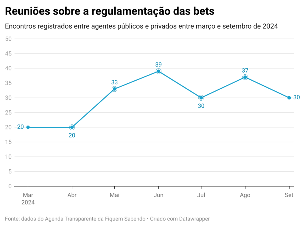 Apesar desses números, o Ministério da Saúde teve participação limitada nas discussões sobre a regulamentação das apostas. Levantamento da Fiquem Sabendo aponta que, entre março e setembro, ocorreram ao menos 209 encontros entre autoridades do Executivo e representantes do setor, mas a pasta esteve presente em apenas dois deles.