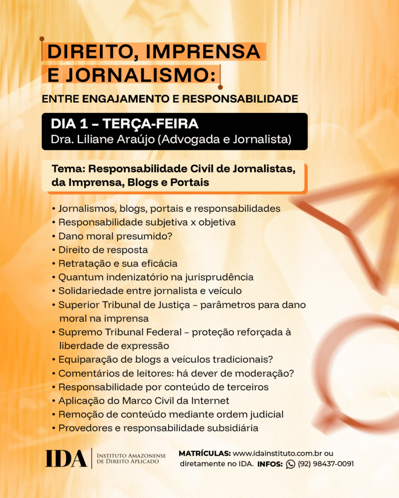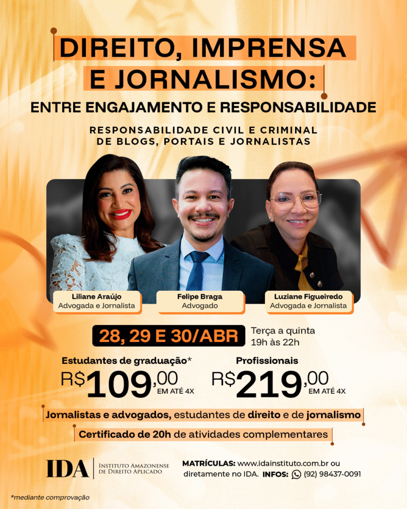 Redação – Com sólida experiência no jornalismo e na advocacia, Liliane Araújo abre a jornada de palestras do curso “Direito, Imprensa e Jornalismo: entre engajamento e responsabilidade”, promovido pelo Instituto Amazonense de Direito Aplicado (IDA), nos dias 28, 29 e 30 de abril. A formação é voltada a jornalistas, advogados e estudantes de Direito e Jornalismo, com aulas das 19h às 22h.