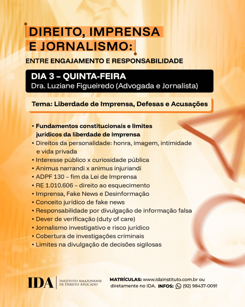 Nos dias 29 e 30, o curso contará ainda com a participação da jornalista e advogada Luziane Figueiredo e do advogado Felipe Braga, que irão aprofundar o debate sobre os limites legais da atuação na imprensa tradicional e digital.